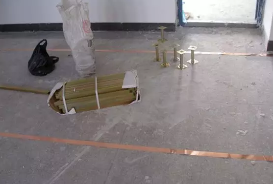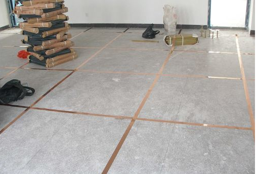 拉水平線,地面彈方格網(wǎng)線,彈線要反復校正。在機房四周墻面安裝角鋼支架,地面按地面彈線鋪設金屬屏蔽網(wǎng)(50*0.1紫銅片),金屬屏蔽網(wǎng)與機房接地銅排相連,組成一個完整的機房屏蔽系統(tǒng),具有接地、抗靜電、抗干擾的作用。