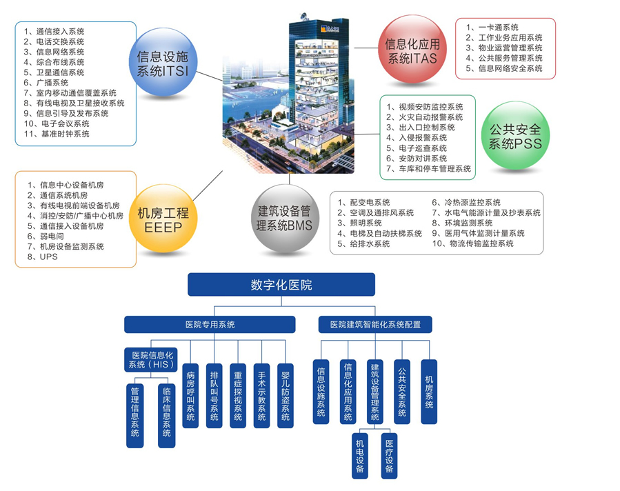 醫(yī)院智能化系統(tǒng)主要包括:信息設(shè)施系統(tǒng)(ITSI)、信息化應(yīng)用系統(tǒng)(ITAS)、建筑設(shè)備管理系統(tǒng)(BMS)、公共安全系統(tǒng)(PSS)、機(jī)房系統(tǒng)(EEEP)。其中信息化應(yīng)用系統(tǒng)中的醫(yī)院專用系統(tǒng)和信息網(wǎng)絡(luò)安全系統(tǒng)最為重要。
